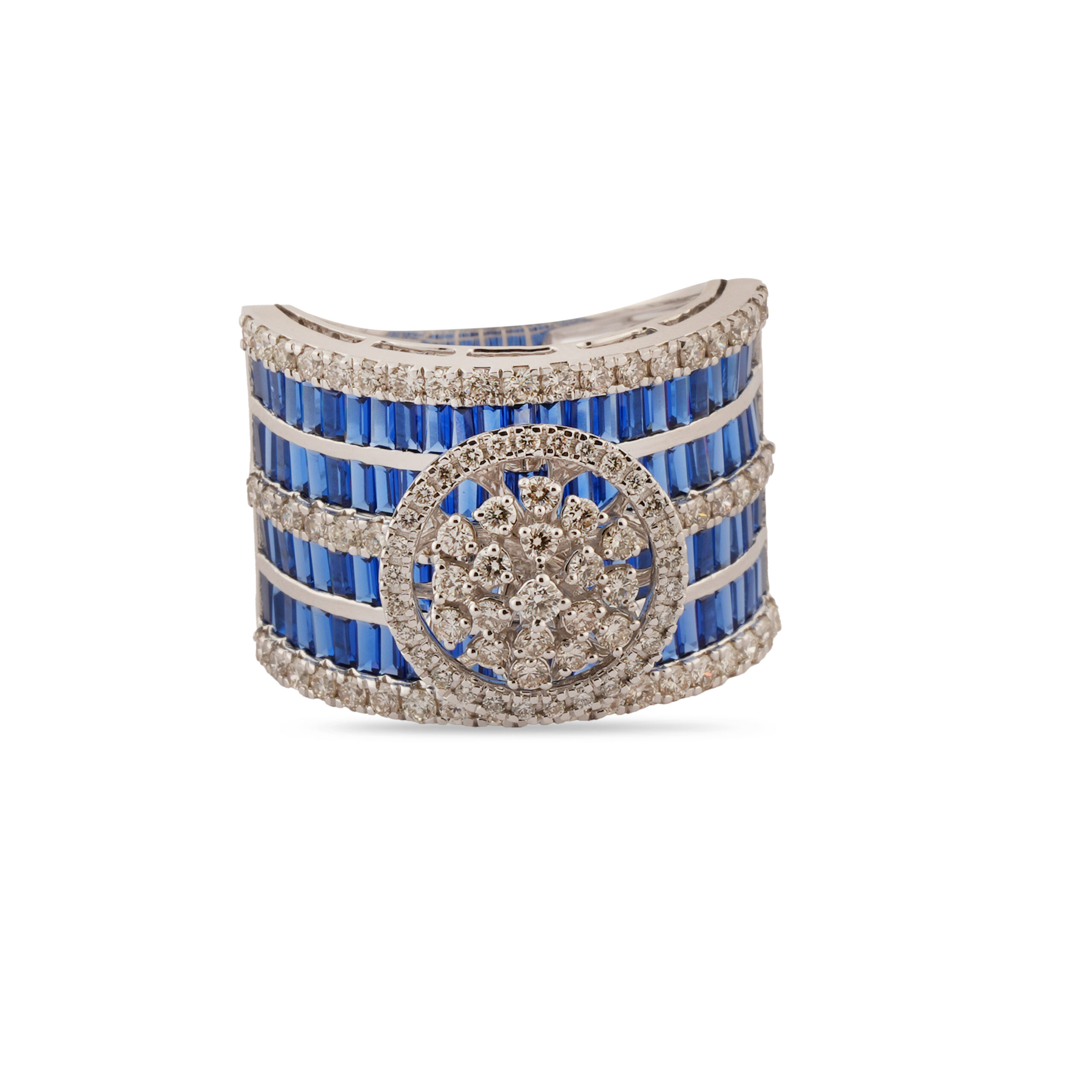 The centerpiece of this magnificent creation is a prominent diamond cluster medallion. Meticulously crafted, the cluster radiates brilliance and highlights the exceptional attention to detail. The interplay between sparkling diamonds and deep blue stones creates a captivating symmetry that draws the eye. Ideal for both special occasions and everyday glamour, this ring is more than just jewelry—it’s a work of art designed to make a statement.