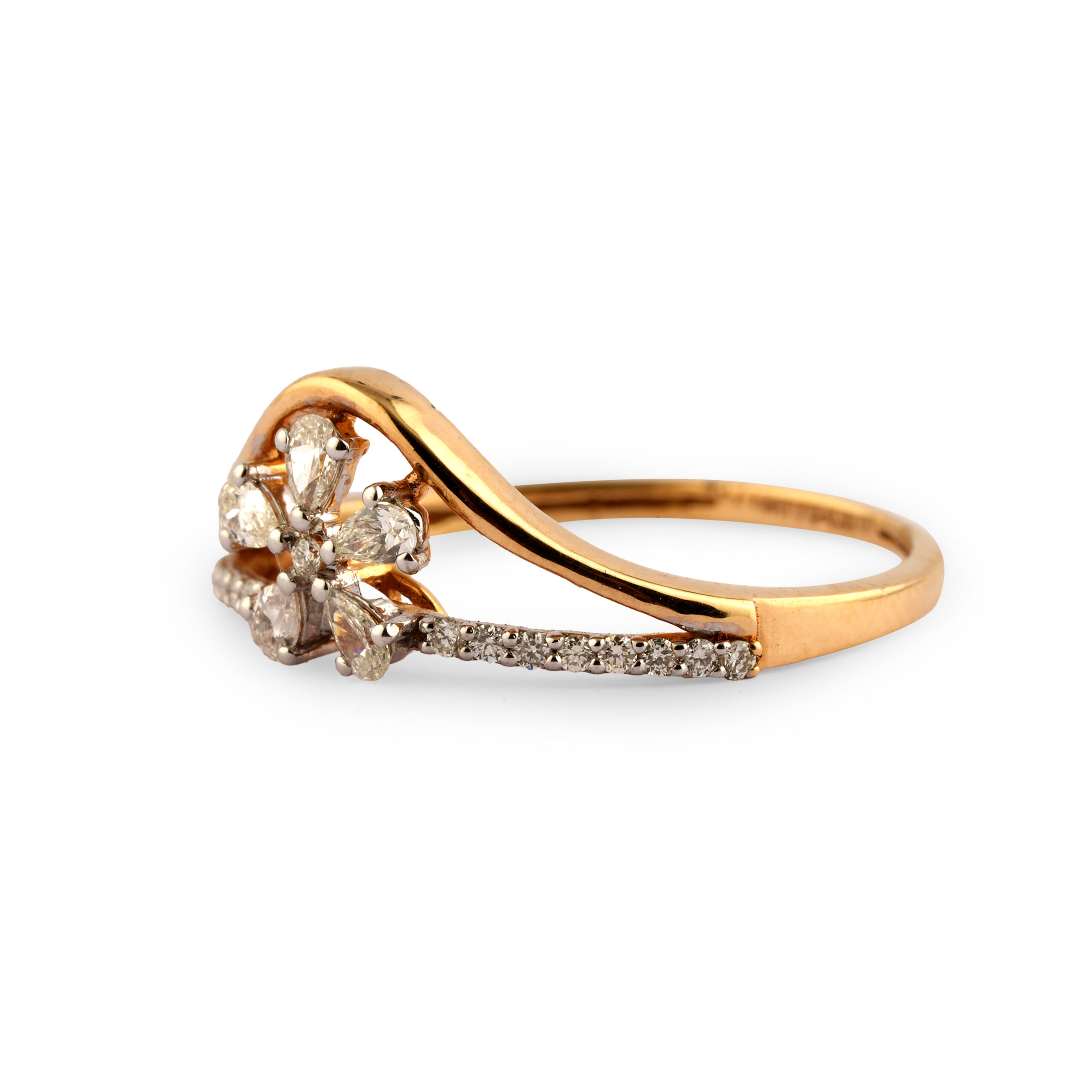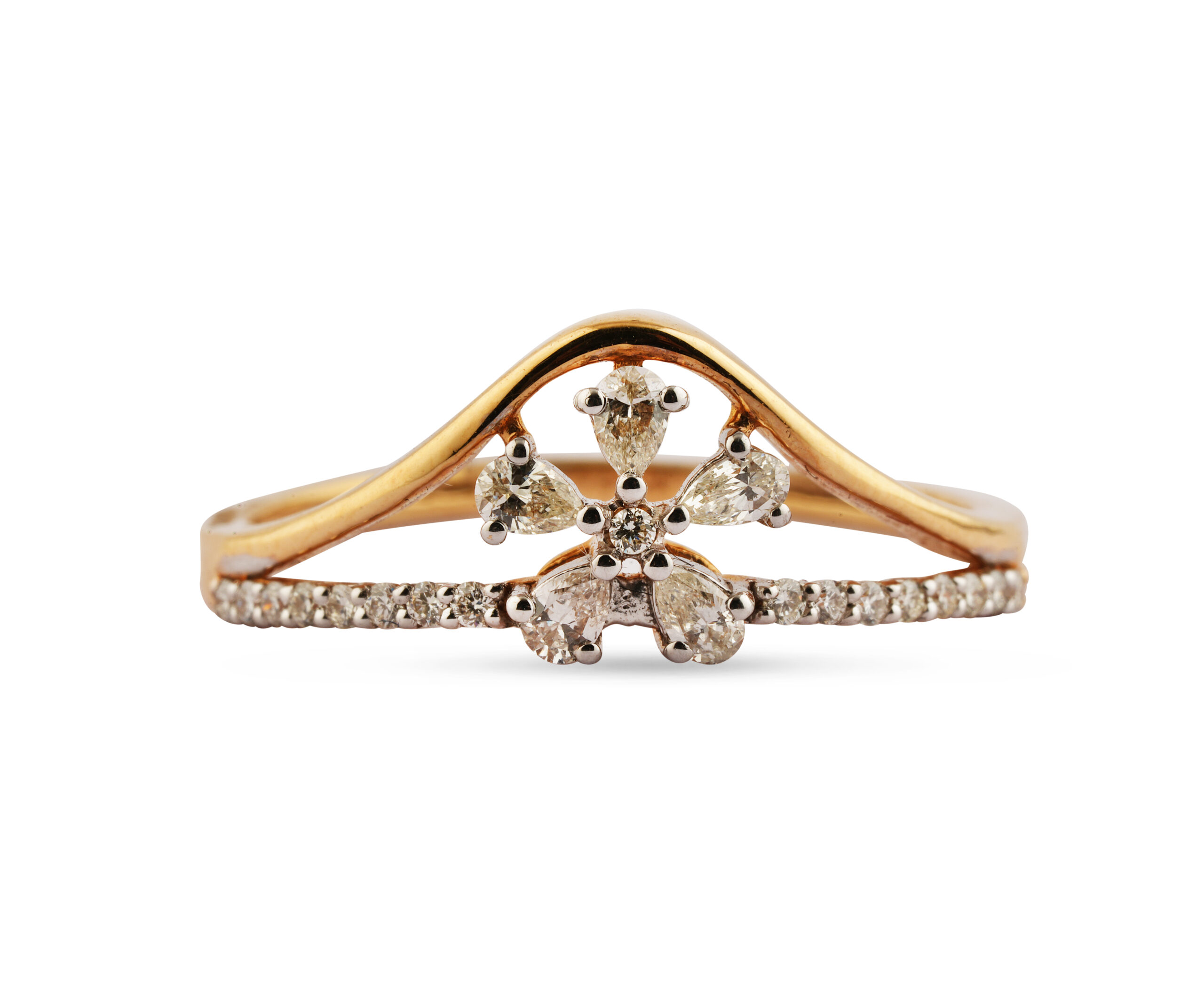 Introducing a truly stunning diamond ring that is sure to captivate your heart and elevate your jewelry collection. This unique design brings together two timeless elements—a graceful wishbone-shaped band and a floral clover-inspired motif. The result is a bold yet delicate accessory that complements any style, making it perfect for everyday elegance or special occasions.