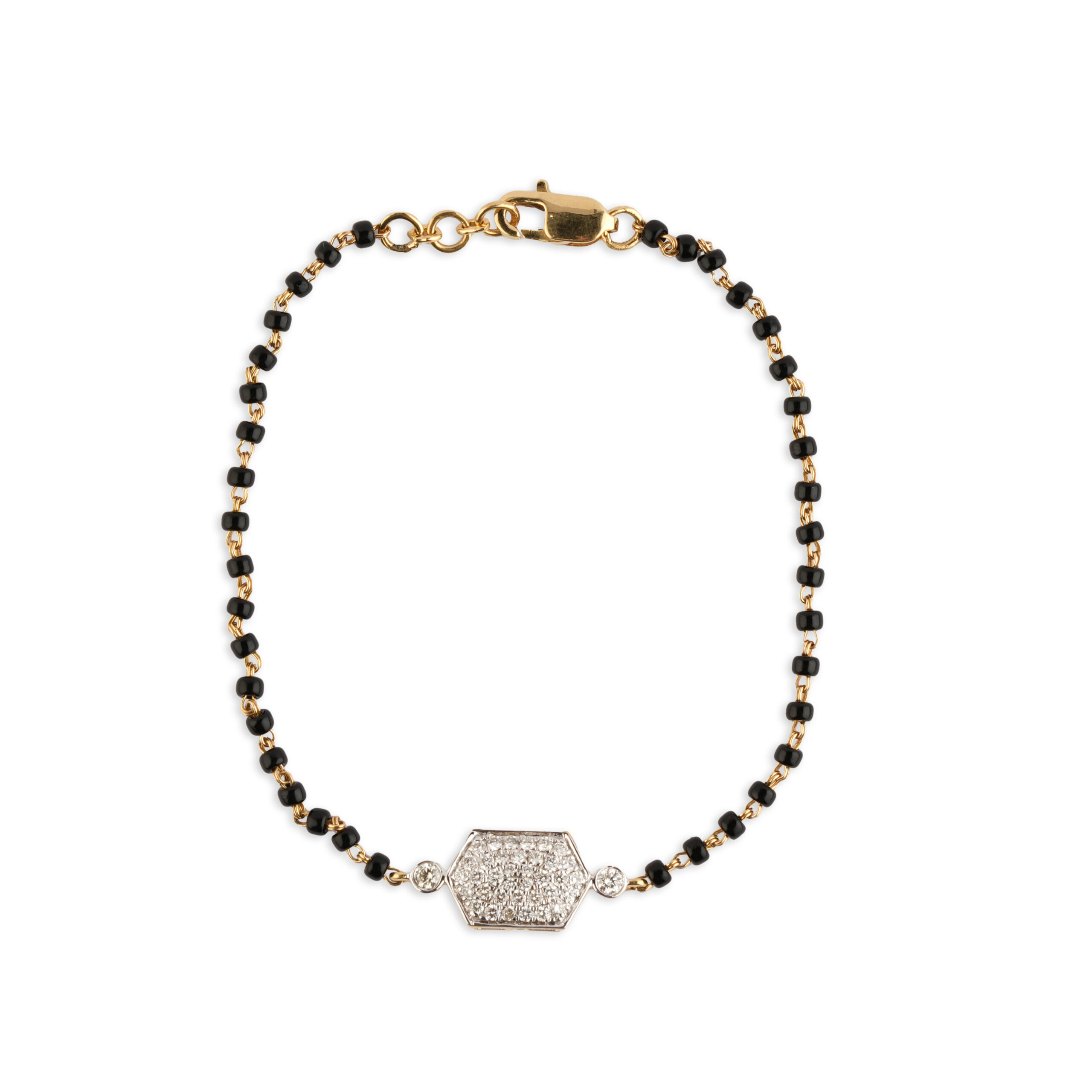 Discover the charm of this exquisite mangalsutra-style bracelet, a harmonious fusion of timeless tradition and contemporary design. This delicate piece flaunts a refined string of small black and gold beads, an iconic symbol of marital love in Indian culture. However, the standout feature is the dazzling hexagonal centerpiece embedded with sparkling diamond accents, giving it a modern twist that is both elegant and trendy.