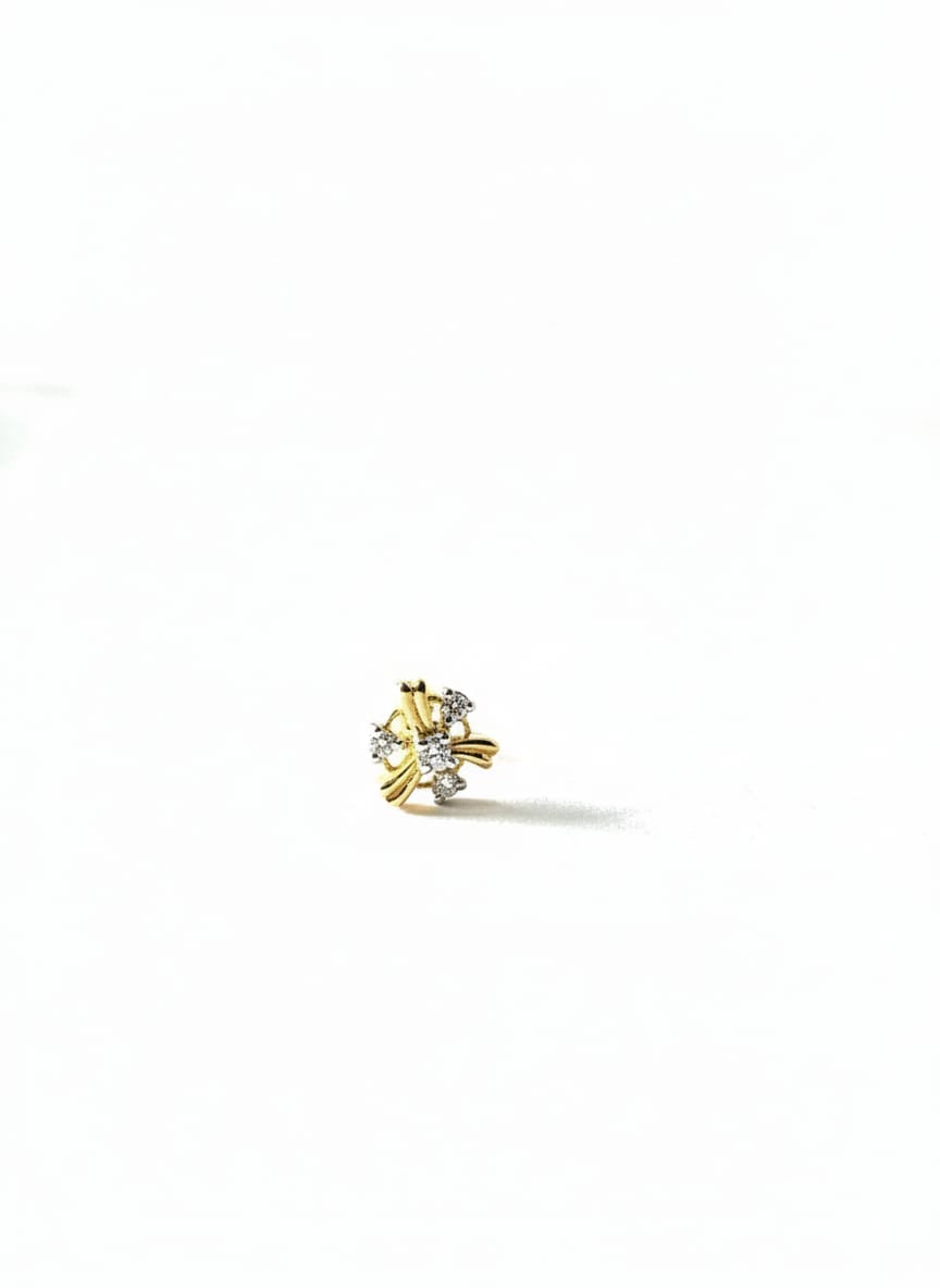 The warm yellow metal tone of the setting and post adds a rich and luxurious aesthetic to this striking nose stud. With its high density of clustered stones, the soft yet prominent rounded form ensures maximum brilliance while maintaining a delicate, sophisticated feel. This meticulously crafted piece redefines wearable beauty, giving you the perfect combination of bold sparkle and understated elegance. ANNP 0008