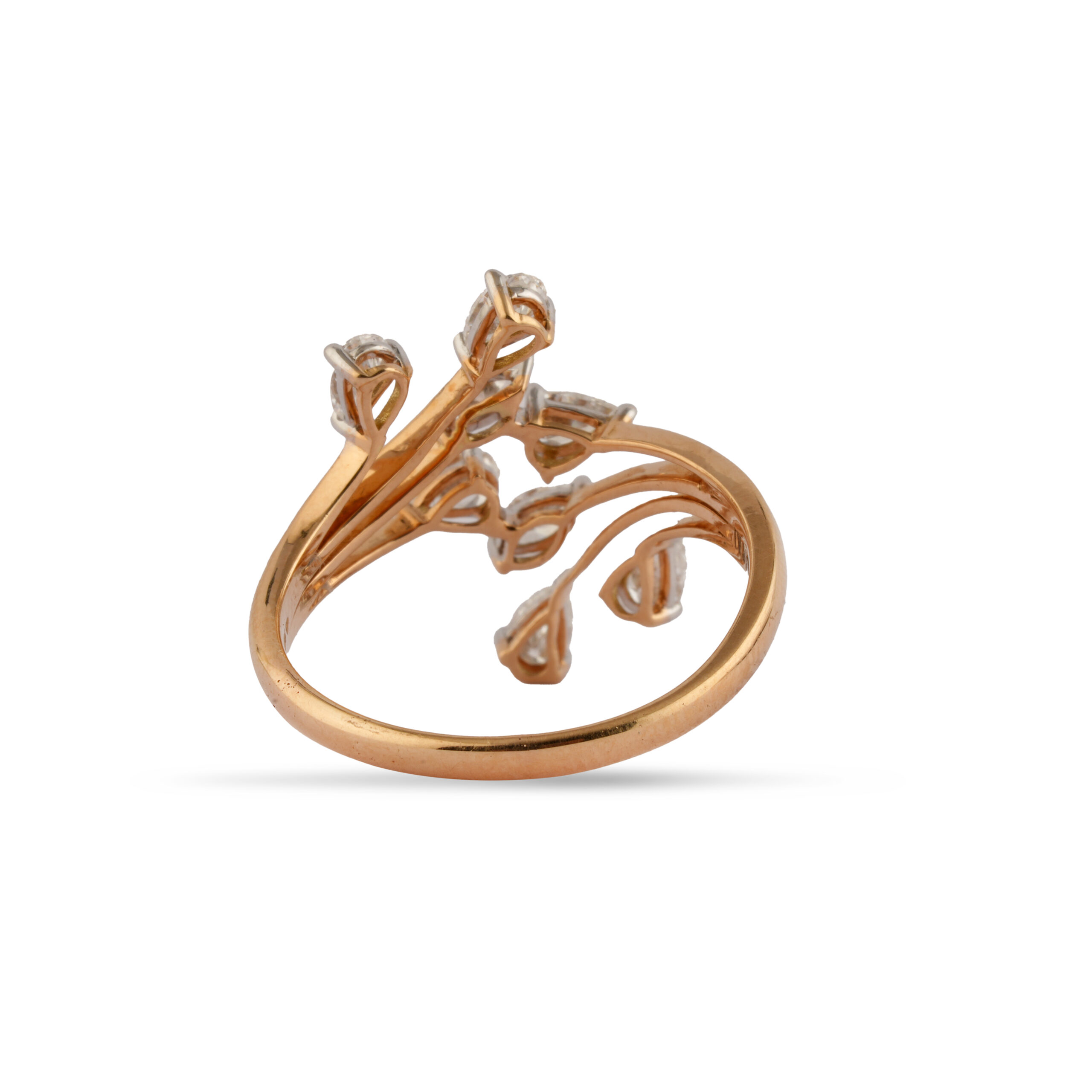 This stunning ring redefines elegance with its extraordinary design. Featuring exquisite pear-shaped diamonds with their delicate teardrop cut, this piece is more than just jewelry – it’s a statement of timeless beauty. Set amidst flowing bands of lush rose gold, the diamonds appear as sparkling drops of water or shimmering foliage, creating a harmonious and organic aesthetic. For those who appreciate a touch of nature-inspired artistry, this ring delivers sophistication with a refreshing botanical charm.