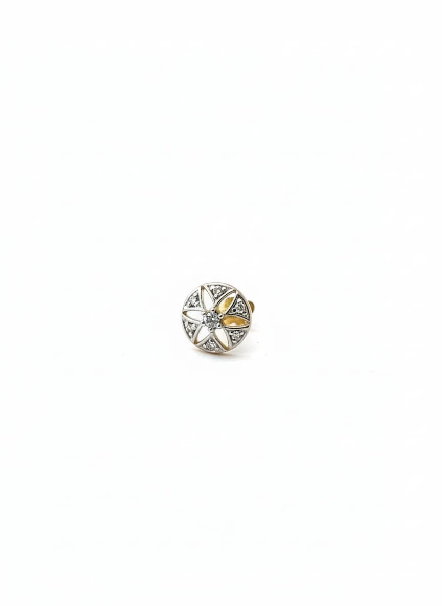 This decorative nose stud, also known as a nose pin, sits gracefully against the skin, adding a touch of vintage charm to your look. The floral motif features a circular, coin-like base adorned with a captivating five or six-petaled flower design. At the heart of the flower, a small, brilliant-cut white stone (crystal or diamond) adds a subtle sparkle. The petals are meticulously crafted using a combination of white enamel or mother-of-pearl and yellow metal (gold-toned), creating a beautiful bi-color effect. The outer border is embellished with a circle of small, white pave-set stones, providing a dazzling frame. With its intricate detailing and artistic design, this flower stud nose pin is a perfect blend of elegance and sophistication. Its silver-toned or white metal setting (like white gold or silver) complements the yellow metal accents, creating a harmonious aesthetic.