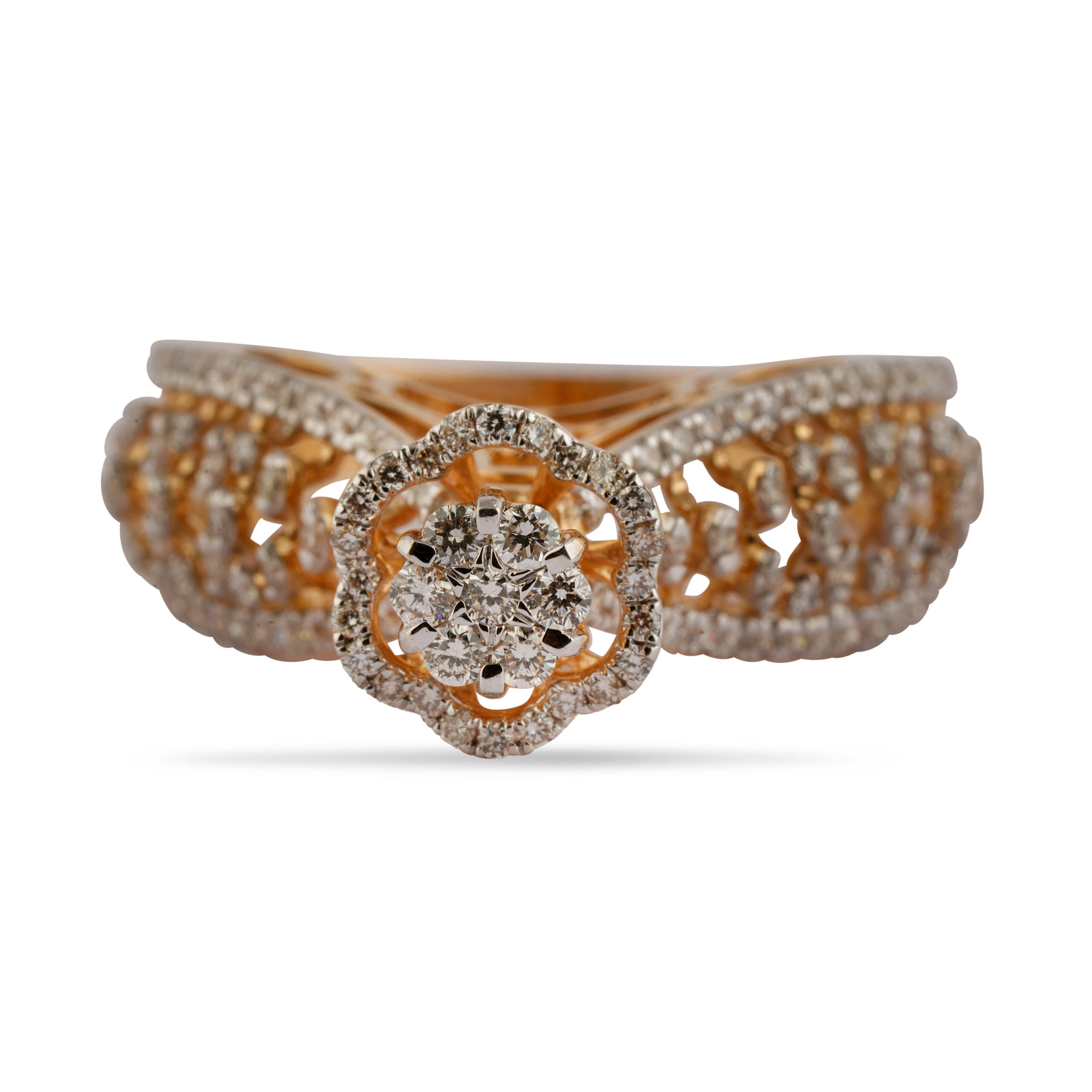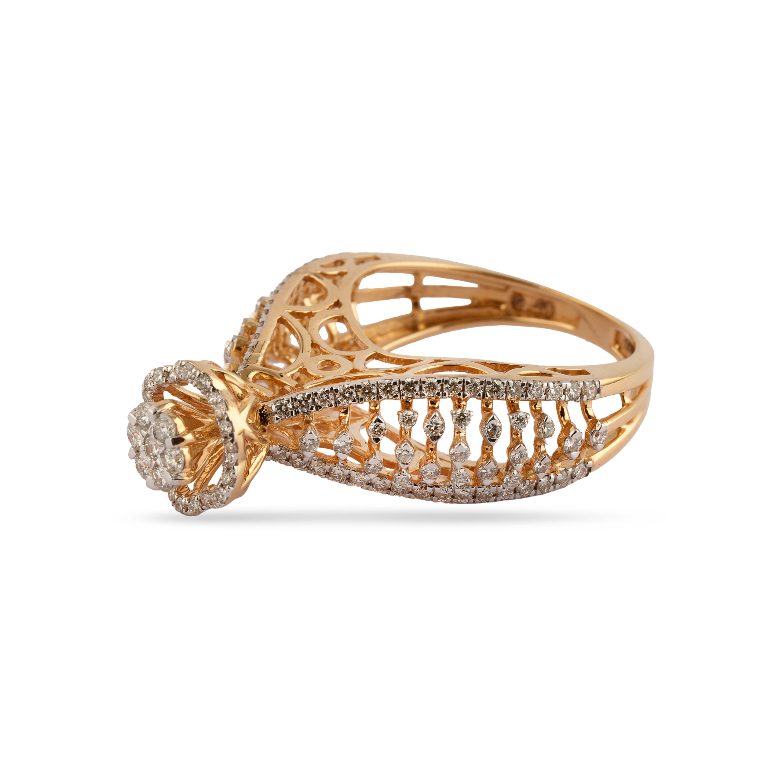 What sets this ring apart is its gallery’s open-work design, evoking a sense of vintage charm and luxury. Every angle reveals a meticulous attention to detail, ensuring that this piece is as stunning on the inside as it is on the outside. The delicate interplay of gold and diamonds creates a harmonious fusion of modern brilliance and classic allure, making it a treasure worthy of your collection.