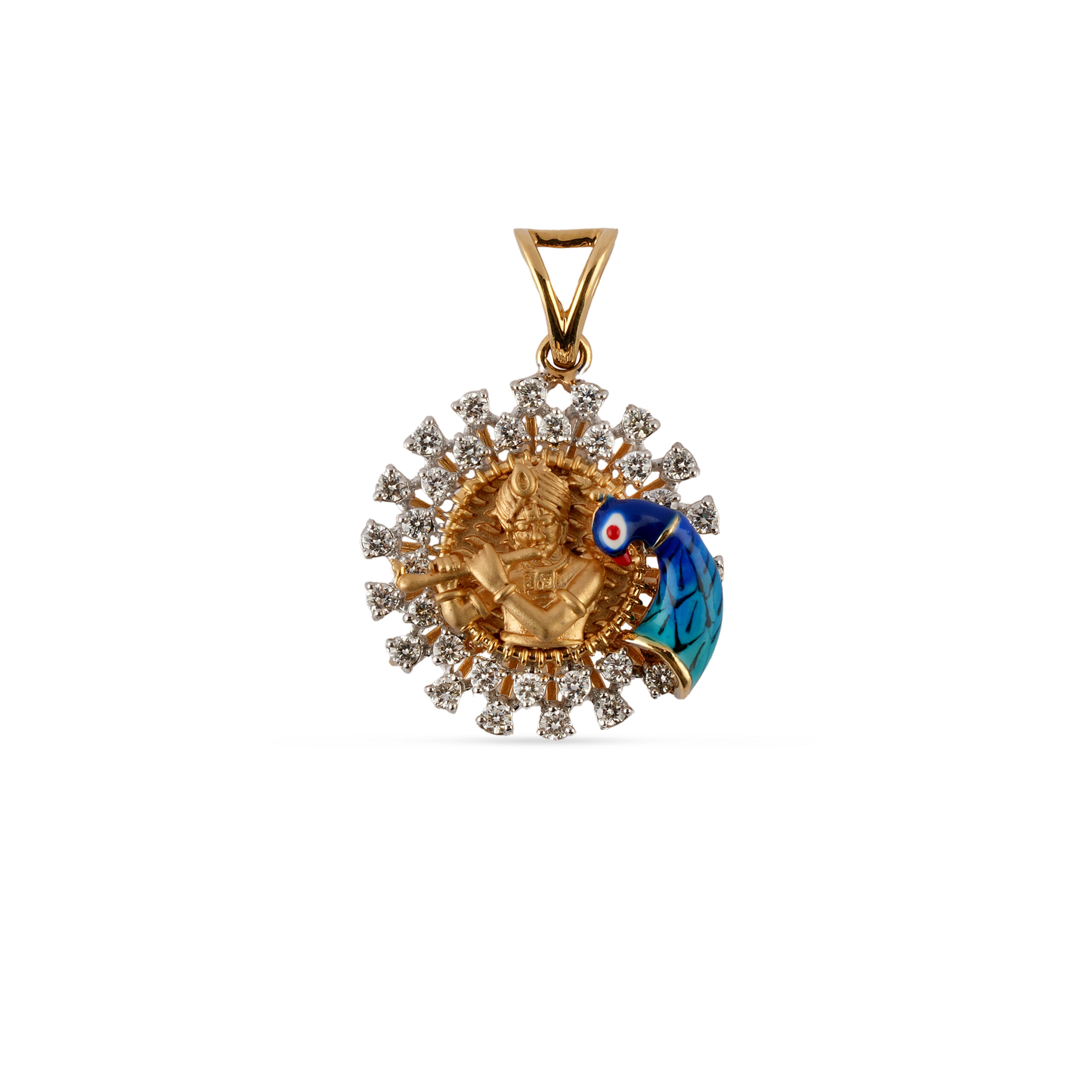 Experience the fusion of spirituality and timeless elegance with our Krisna with Mayur Diamond Design Pendant. Inspired by the divine charm of Lord Krishna and adorned with the intricate details of a peacock motif, this pendant offers a perfect blend of cultural heritage and modern artistry. Crafted with precision and care, this statement piece highlights the beauty of diamond accents to evoke a sense of sophistication and grace. Ideal for both festive celebrations and everyday wear, it is more than just an accessory – it’s a beautiful story waiting to be cherished.