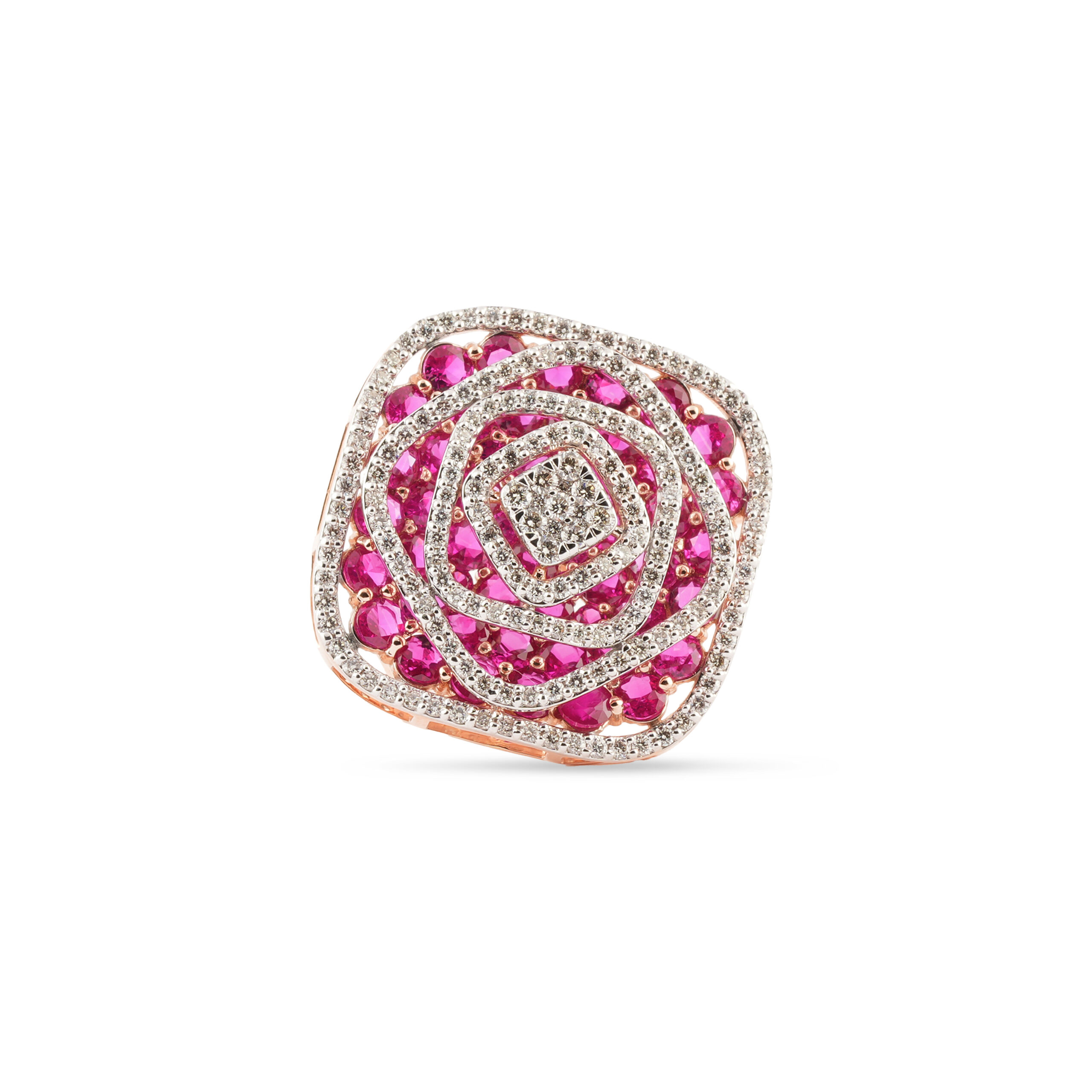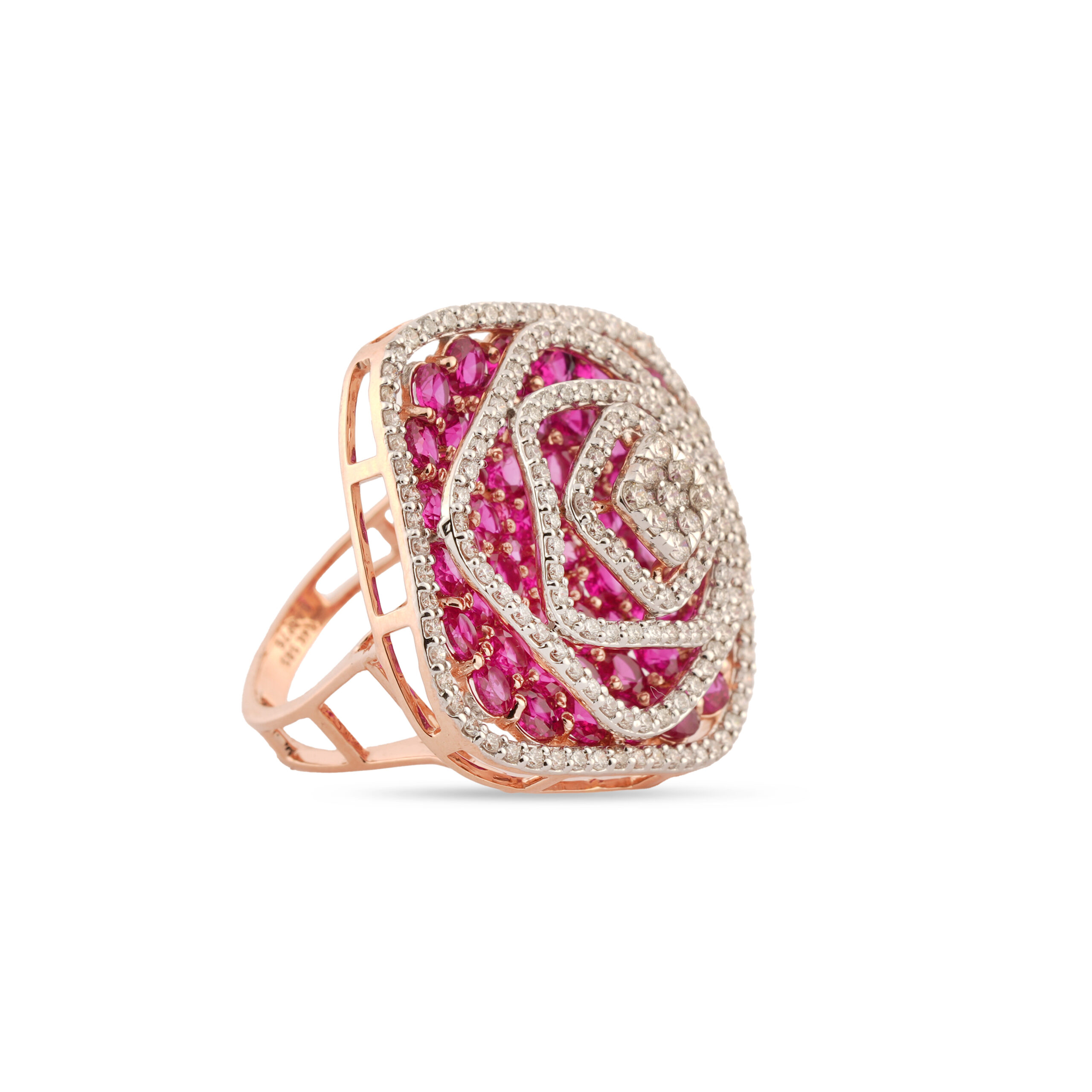 The cocktail ring dazzles with deep-red stones, likely rubies or pink tourmaline, which exude a rich vibrancy. Complementing the fiery reds are brilliant white diamonds that sparkle with every movement. Together, these stones create a striking contrast against the rose gold-tone metal, enhancing the ring’s opulent charm. Each detail is intricately designed to evoke timeless beauty while embracing modern trends.