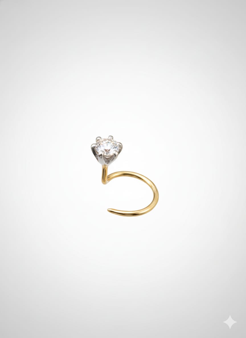 The centerpiece of this nose pin is a stunning solitaire diamond, meticulously held by four or six delicate claws that maximize its sparkle and visibility. Whether it’s a brilliant-cut diamond or a cubic zirconia (or another clear gemstone), you’ll notice the exceptional brilliance that draws the eye. The setting is crafted in white gold or platinum, enhancing the gem’s radiance and creating a striking contrast against the shaft. Together, these elements blend seamlessly to create a minimalist yet statement-making design ideal for everyday glamour.