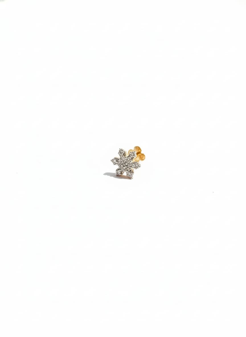 The standout feature of this stud is its intricate snowflake or starburst design. Its six symmetrical arms radiate from the center, reminiscent of nature’s most captivating shapes. This classic pattern is adorned with small, round-cut, colorless stones that enhance its brilliance. Whether styled as a small floral star or a glimmering snowflake, this design promises a touch of seasonal charm or understated elegance wherever it’s worn.