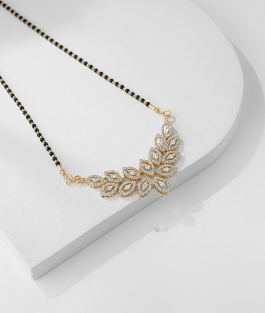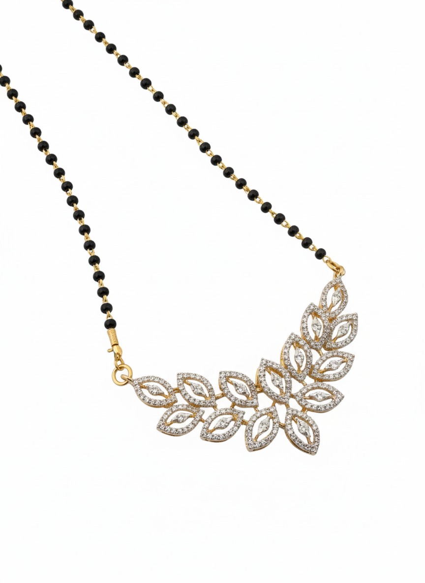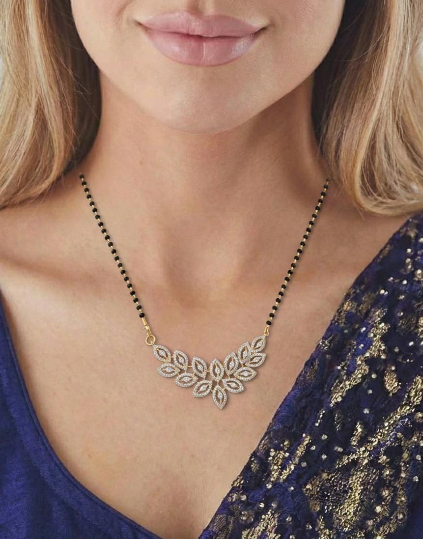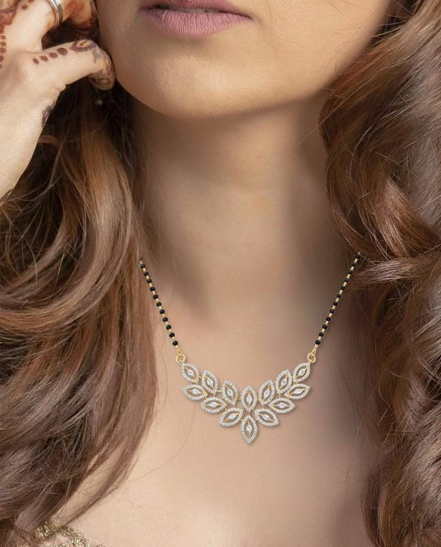 Meticulously crafted with premium materials, this Mangalsutra ensures durability without compromising elegance. The black-beaded chain symbolizes the traditional aspect of marital bonds, while the radiant diamonds bring a fresh and fashionable perspective. Its lightweight design guarantees comfort for daily wear, whether paired with casual outfits or festive attire. This is the ideal piece for any modern bride or married woman seeking to blend tradition with contemporary luxury.