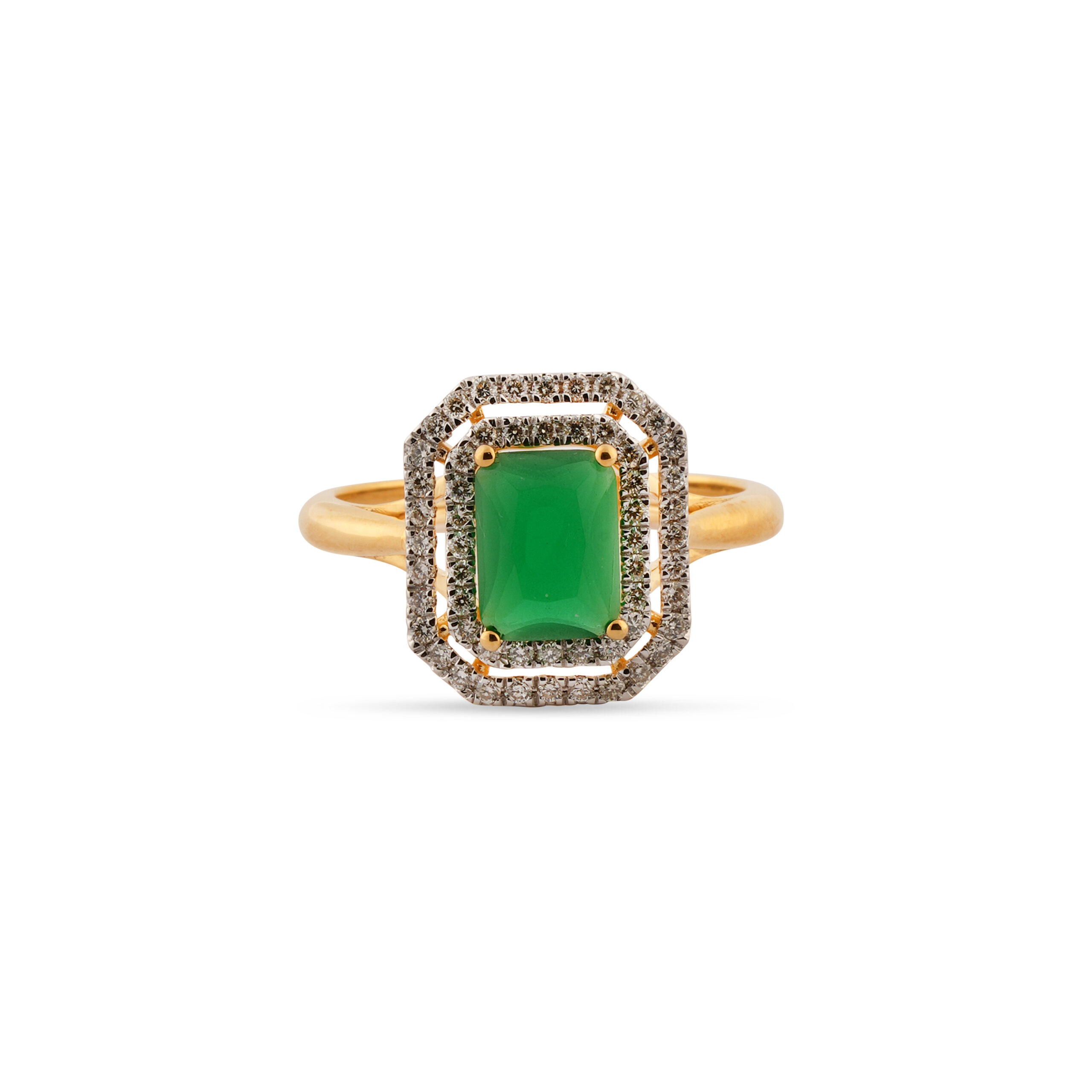 The centerpiece emerald-cut gemstone is beautifully complemented by a stepped or double geometric halo of smaller stones, meticulously arranged to create dazzling brilliance. These surrounding stones enhance the deep green hue and add depth to the ring’s overall design, producing captivating sparkles with every movement. The halo’s sharp geometric lines and layering expertly replicate the rich aesthetic details that define the Art Deco period, exuding timeless artistry. The intricate symmetry ensures this ring is not just a piece of jewelry, but a wearable work of art.
